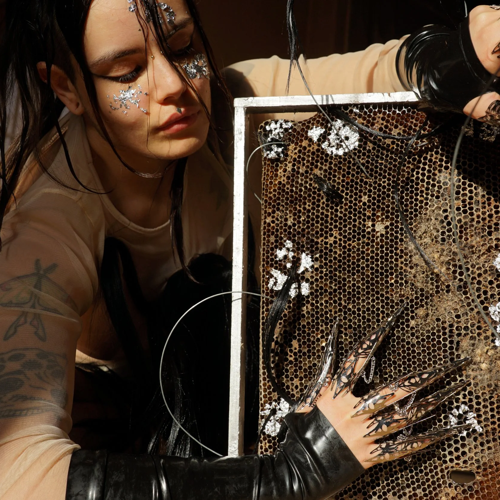 Miraculous Alchemies (Turn my lead to silver) is a Grimoire, a magic book grown through honey comb, moonlight infused honey, hand-made paper with plants from the local forest and fur offerings. This book is alive, shapeshifting, humming with the sound of bees and the healing howls of the outcasted ones – human and nonhuman, who spellcast stories of communal resistance, symbiosis, adaptation and multispecies ancestrality.